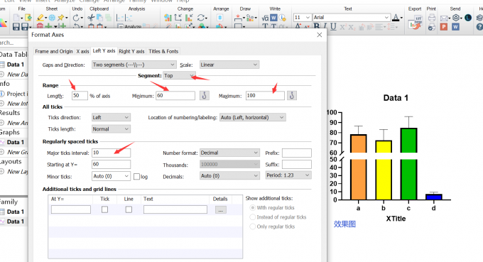 然后可以调整下面的部分,点击Segment选项里的Bottom,下段的y轴的展示范围也选择50%。因为d组的数值只分布在4到10之间,所以下段的数值的范围改成0到10之间,数值间隔选择2。修改完成后,点击ok,一幅分段式的柱状图绘制完成了。