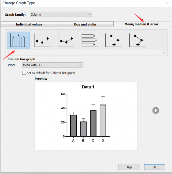 将刚才复制的数据粘贴到新建的GraphPad表格中。粘贴过来后,我们切换到图形这里,点击Graphs里的Data 1。弹出Change Graph Type窗口,选择Mean/median & error里的第一幅图柱状图。